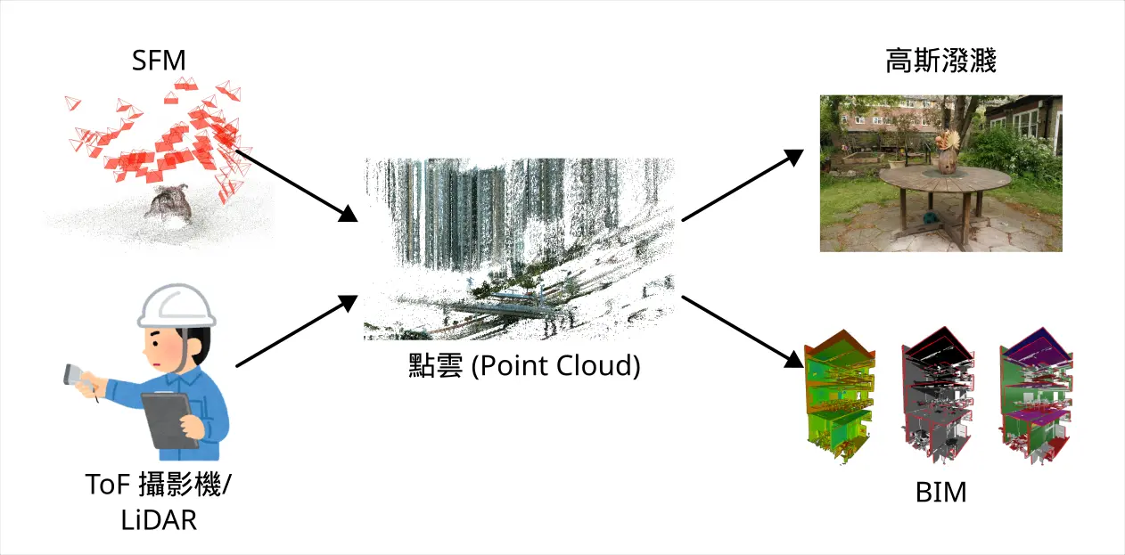 我們會透過 ToF 攝影機或光達 (LiDAR) 之類的工具來掃描現實世界的物體,這些資訊會以點雲 (point cloud) 的形式儲存。