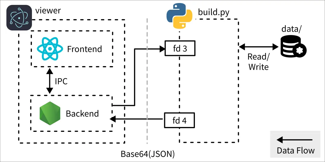 viewer 是一個 Electron 實做。server 則是一個薄封裝,實作了簡單的佇列,並且會從 Python 那邊的實作 (build.py) spawn 一個 process。
