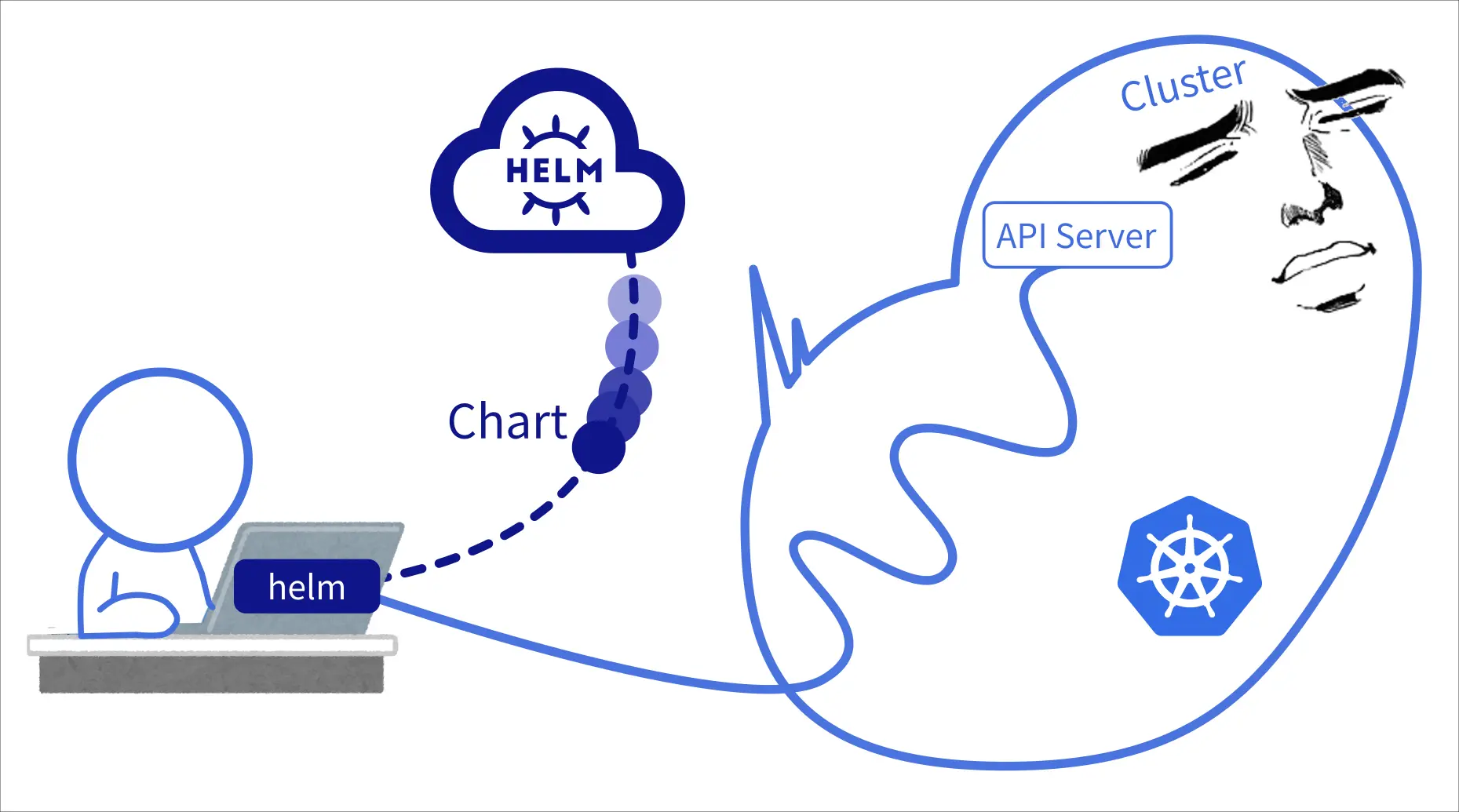 在 Helm 的世界,這一堆聲明的 YAML 被包裝成一個稱作 Chart 的東西,「安裝」(佈署應用程式到 K8s)大概像這樣: