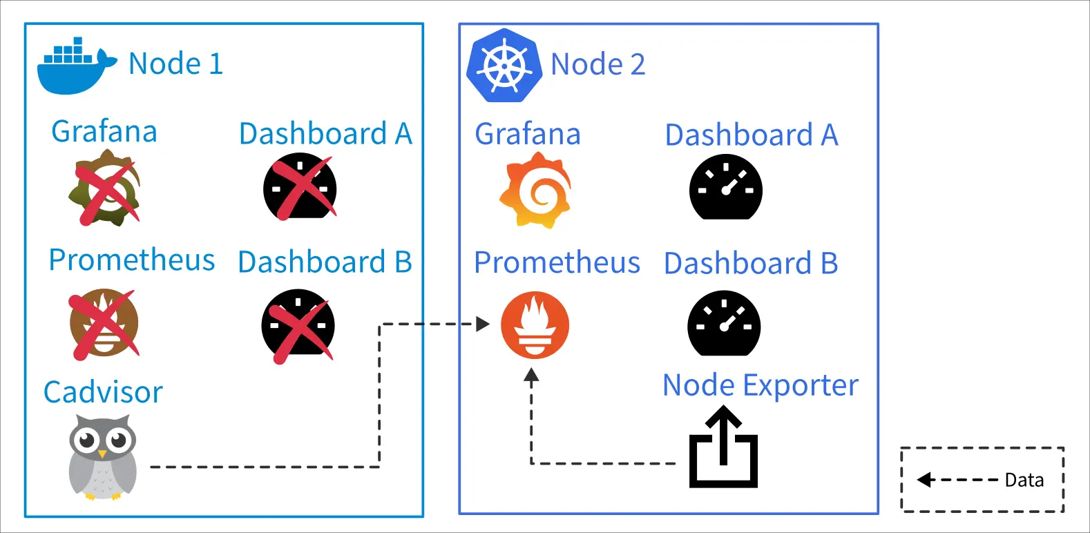 用 K8s 內的 Prometheus 和 Grafana 實例取代原本的,原本的兩張 Dashboard 則是本來就有 JSON 檔直接移過去。原本的伺服器指保留 Cadvisor 供新的 Prometheus 採集資料。