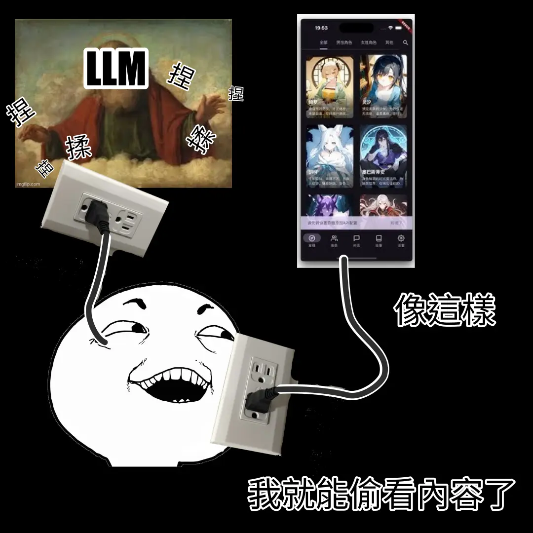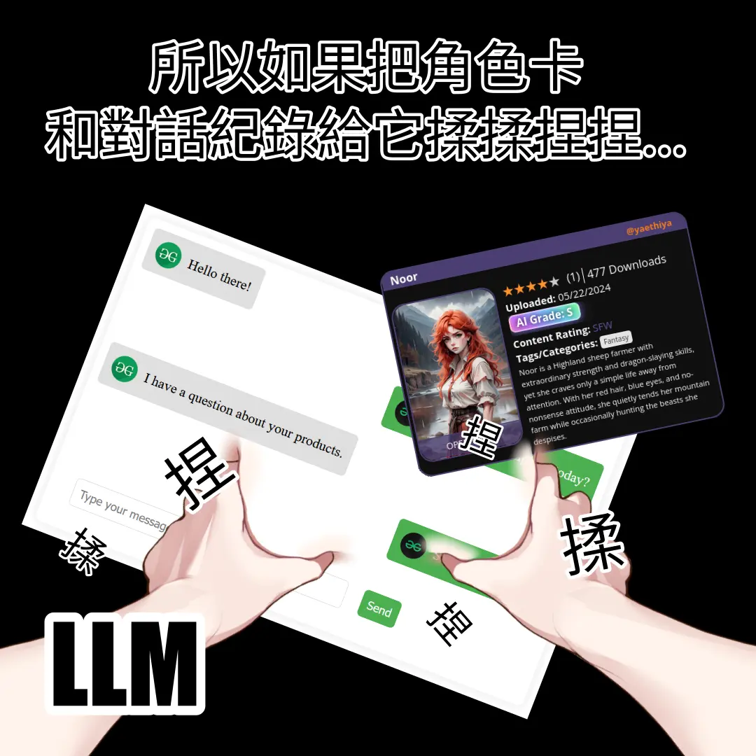 「角色卡」是一種角色扮演類 LLM 應用軟體的資料包,本質上是包含一堆人物設定、世界觀設定、台詞樣板...的文字。